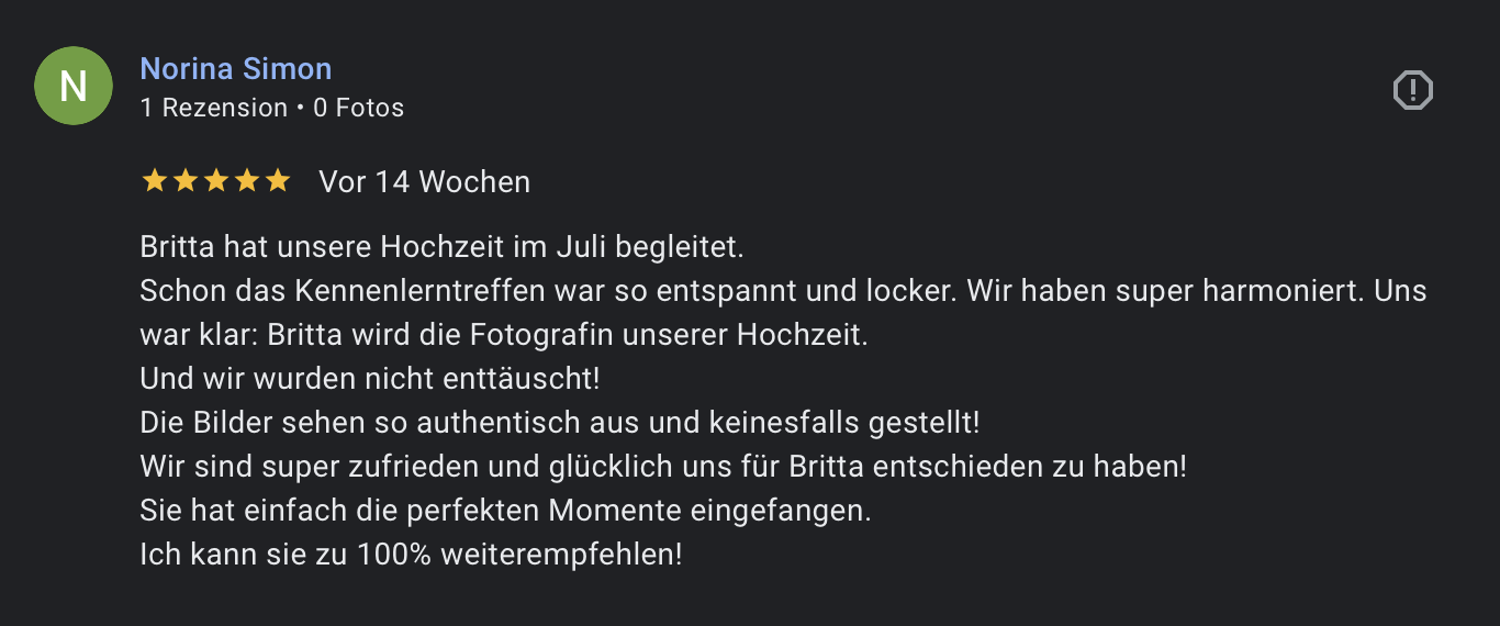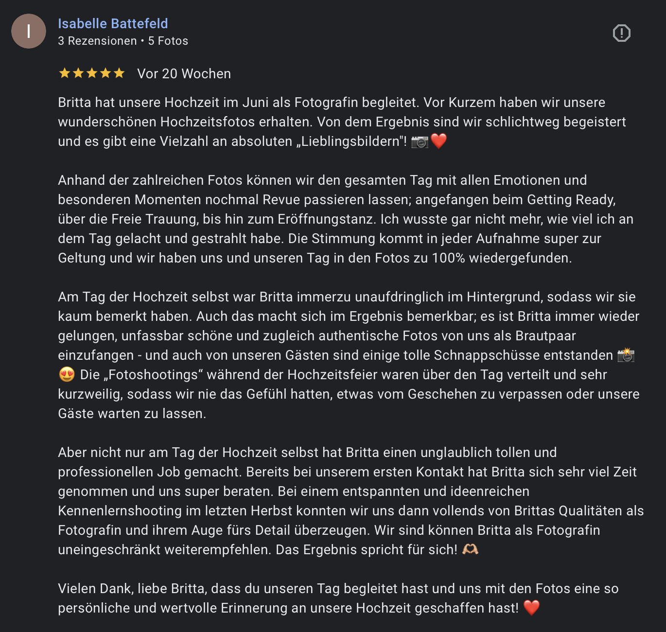 An dieser Stelle höre ich euch zu, gebe Ratschläge, wenn nötig und versuche mit viel Feingefühl und Erfahrung die Weichen für einen grandiosen Hochzeitstag mit grandiosen Fotos zu stellen.
